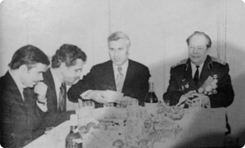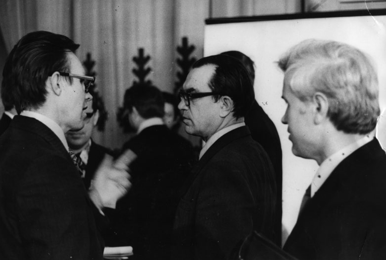 В президиуме конференции, слева направо: первый секретарь Марийского обкома КПСС В.П. Никонов, академик В.М. Глушков, профессор А.И. Половинкин, фото из газеты «Марийская правда»