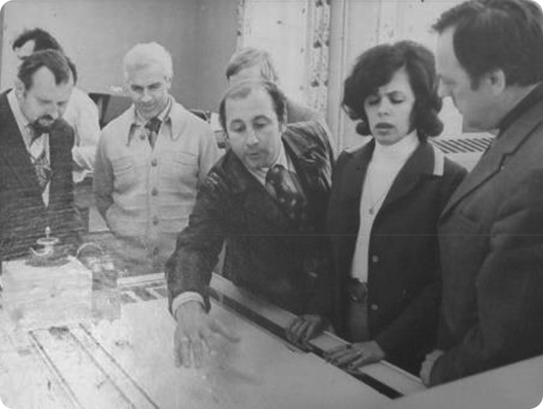 Руководитель НИЛ ММОП А. И. Половинкин и начальник ВЦ Ю. Ц. Файтельсон демонстрируют профессорам из ГДР результаты своего творчества