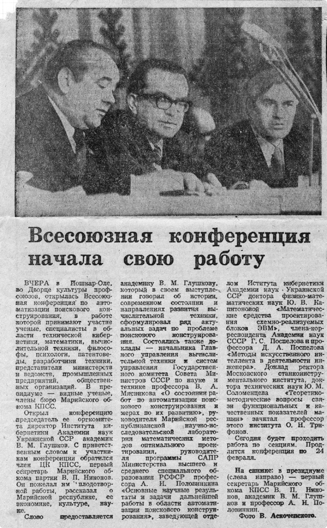 В 1978 году Йошкар-Оле состоялась первая Всесоюзная конференция по проблемам автоматизации начальных этапов проектирования технических систем.